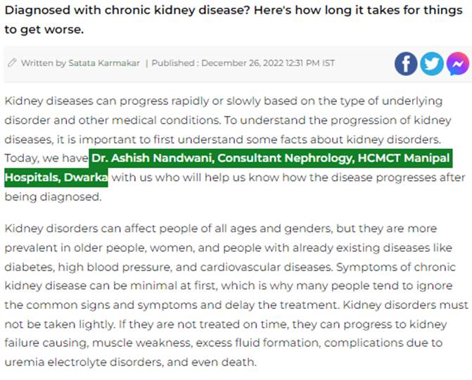 Kidney diseases can progress rapidly or slowly based on the type of underlying disorder and other medical conditions. To understand the progression of kidney diseases, it is important to first understand some facts about kidney disorders. Today, we have Dr. Ashish Nandwani, Consultant Nephrology, HCMCT Manipal Hospitals, Dwarka with us who will help us know how the disease progresses after being diagnosed.