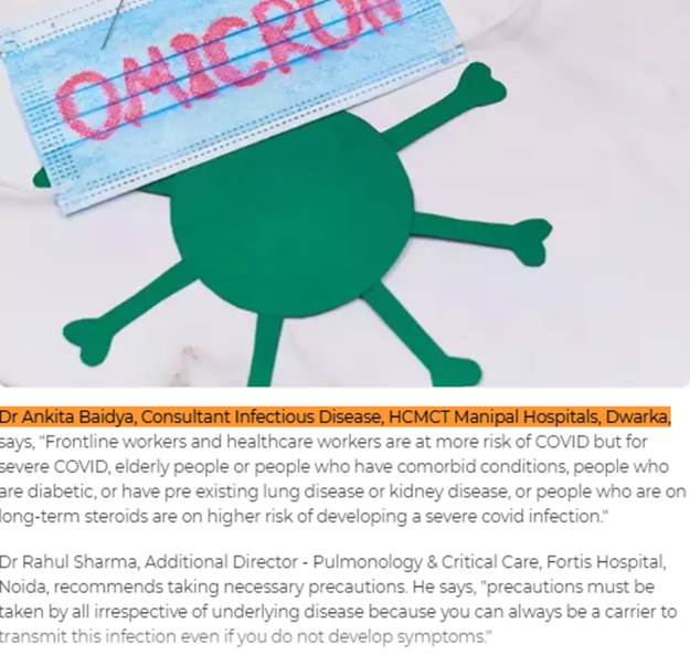 Dr. Ankita Baidya, Consultant Infectious Disease, HCMCT Manipal Hospitals, Dwarka, says, "Frontline workers and healthcare workers are at more risk of COVID but for severe COVID, elderly people or people who have comorbid conditions, people who are diabetic, or have pre-existing lung disease or kidney disease, or people who are on long-term steroids are on higher risk of developing a severe covid infection."