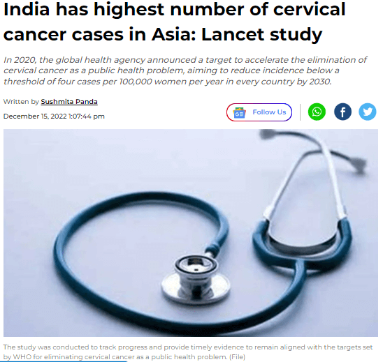India has come out as the major contributor to cervical cancer in Asia, a study published in The Lancet journal on Wednesday revealed.
