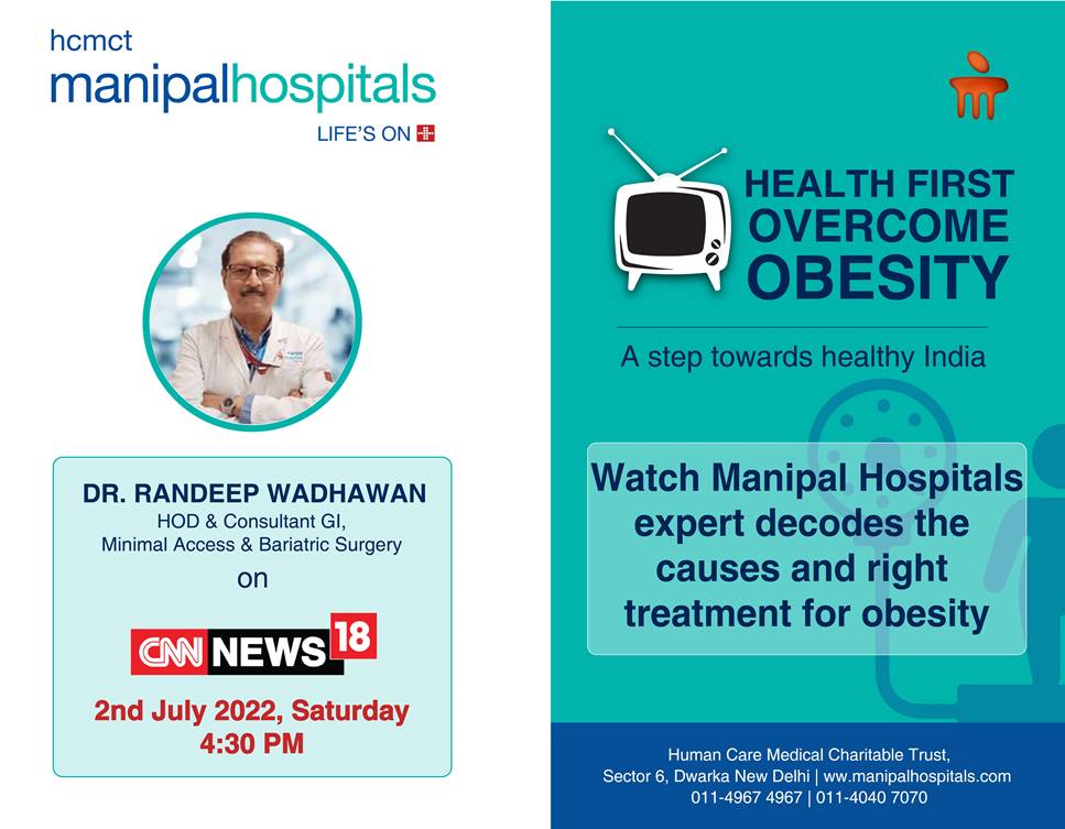 Watch Dr. Randeep Wadhawan, HOD - Department of Minimal Access Surgery, Bariatric & Metabolic, and Gastrointestinal Surgery, Manipal Hospitals Delhi on CNN News18 today at 4.30pm. He shares insights on obesity and the treatment available at our hospital.