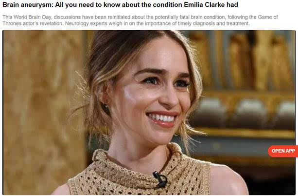 Headline: Brain aneurysm: All you need to know about the condition Emilia Clarke had