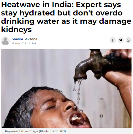 Headline: Heatwave in India: Expert says stay hydrated but don't overdo drinking water as it may damage kidneys