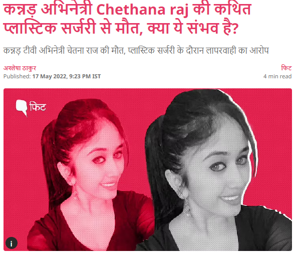 Headline: Kannada actress Chethana raj reportedly died of plastic surgery, is it possible?
