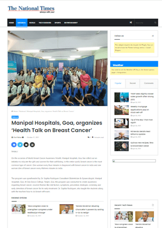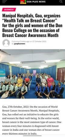 Topic: Manipal Hospitals, Goa, organizes “Health Talk on Breast Cancer” for the girls and women of the Don Bosco College on the occasion of Breast Cancer Awareness Month