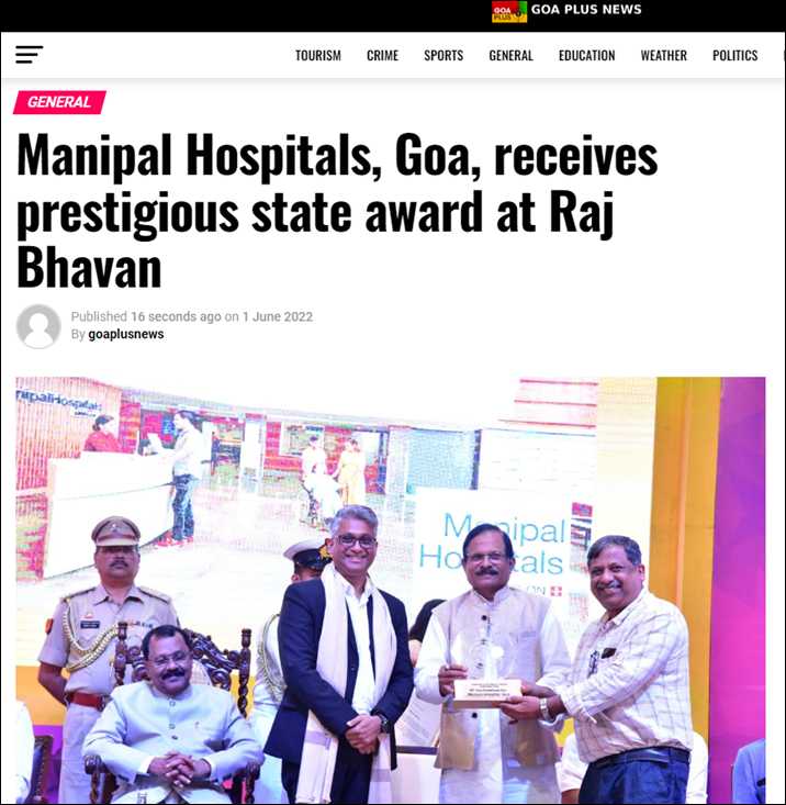 Headline: Manipal Hospitals, Goa, receives prestigious state award at Raj Bhavan