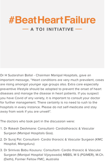 Our Heart specialists from MH Goa, Vijayawada & KMC Hospital, Mangalore participated in the webinars from across India, sharing their thoughts on the Heart health – Prevention, understanding the common signs of the Heart Attack and the first response required to get the immediate emergency medical response.