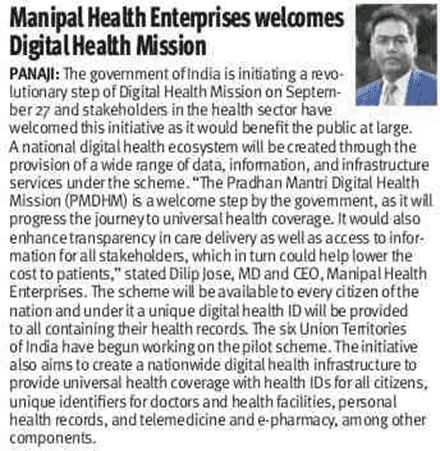 The Pradhan Mantri Digital Health Mission (PMDHM) is a welcome step by the government, as it will progress the journey to universal health coverage. It would also enhance transparency in care delivery as well as access to information for all stakeholders, which in turn could help lower the cost to patients, said Mr. Dilip Jose, MD & CEO, Manipal Health Enterprises Pvt Ltd.
