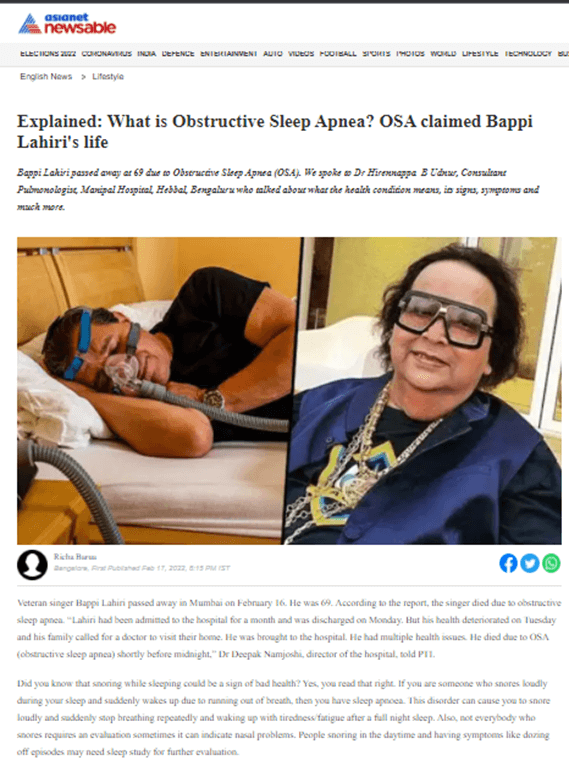 Did you know that snoring while sleeping could be a sign of bad health? Yes, you read that right. If you are someone who snores loudly during your sleep and suddenly wakes up due to running out of breath, then you have sleep apnoea. This disorder can cause you to snore loudly and suddenly stop breathing repeatedly and waking up with tiredness/fatigue after a full night sleep, said Dr. Hirennappa B Udnur, Consultant Pulmonologist, Manipal Hospital Hebbal