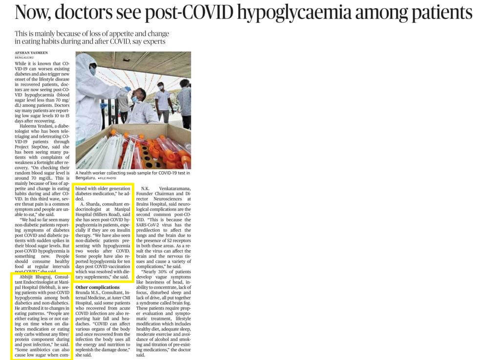 We have also seen non-diabetic patients presenting with hypoglycemia two weeks after COVID. Some people have also reported hypoglycemia for ten days post-COVID vaccination which was resolved with dietary supplements, said Dr. Sharda A, Consultant Endocrinologist, Manipal Hospital Millers Road.