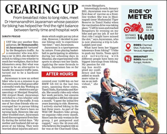 My mother and husband did not approve of my biking. They were worried about injuries and accidents which might put my job at risk. However, I decided to pursue biking only to experience ‘me-time, said Dr Hemanandini Jayaraman, Consultant - Obstetrics and Gynaecology, Manipal Hospitals, Old Airport Road.