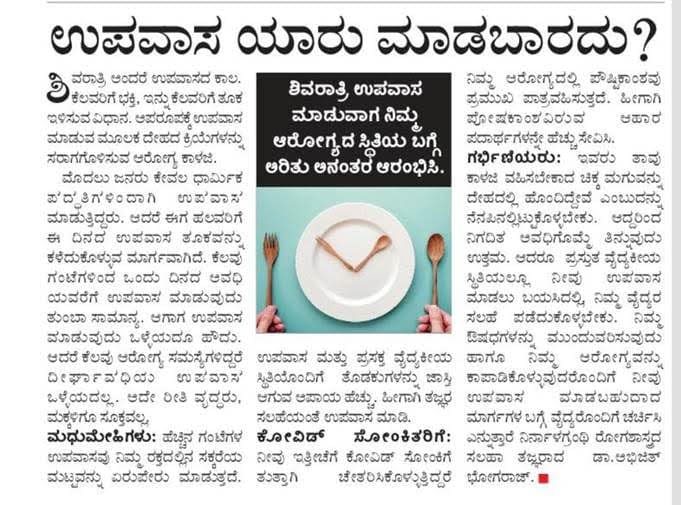 Shivarathri means fasting period. Devotion to some, and weight loss to others. Rarely health concerns ease body functions by fasting. Previously, people fasted only on religious practices. But if you have some health problems, a long-term approach is not good. The same is not appropriate for the elderly and children. By, Dr. Abhijit Bhograj, Consultant Endocrinologist, Manipal Hospital Hebbal, Bengaluru.