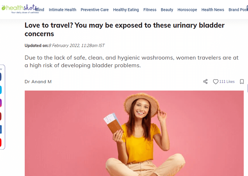 Apart from the unavailability of clean and hygienic toilet spaces, other reasons also increase the chances of urinary tract infection in women travelers. The urethra of the female is shorter, making them more vulnerable to infection. The trouble is further increased due to the closeness of the female urinary tract to the anus. Lack of hygienic and safe places during traveling, especially at night, forces the women to hold their urge for urination for a significant period. It also contributes to urinary tract infections., said Dr Anand M, Senior Consultant- Urologist, Manipal Hospital, Malleshwaram.