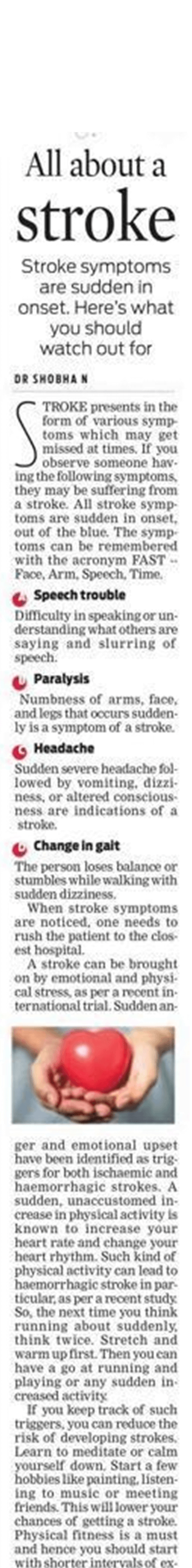 Physical fitness is a must and hence you should start with shorter intervals of exercise. Gradually increase it to improve your stamina and not trigger yourself into a stroke, said Dr Shobha N, Neurologist and Stroke Physician, Manipal Hospitals, Malleshwaram.