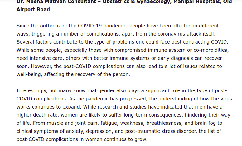 From muscle and joint pain, fatigue, weakness, breathlessness, and brain fog to clinical symptoms of anxiety, depression, and post-traumatic stress disorder, the list of post-COVID complications in women continues to grow, said Dr. Meena Muthiah, Consultant – Obstetrics & Gynaecology, Manipal Hospitals, Old Airport Road.