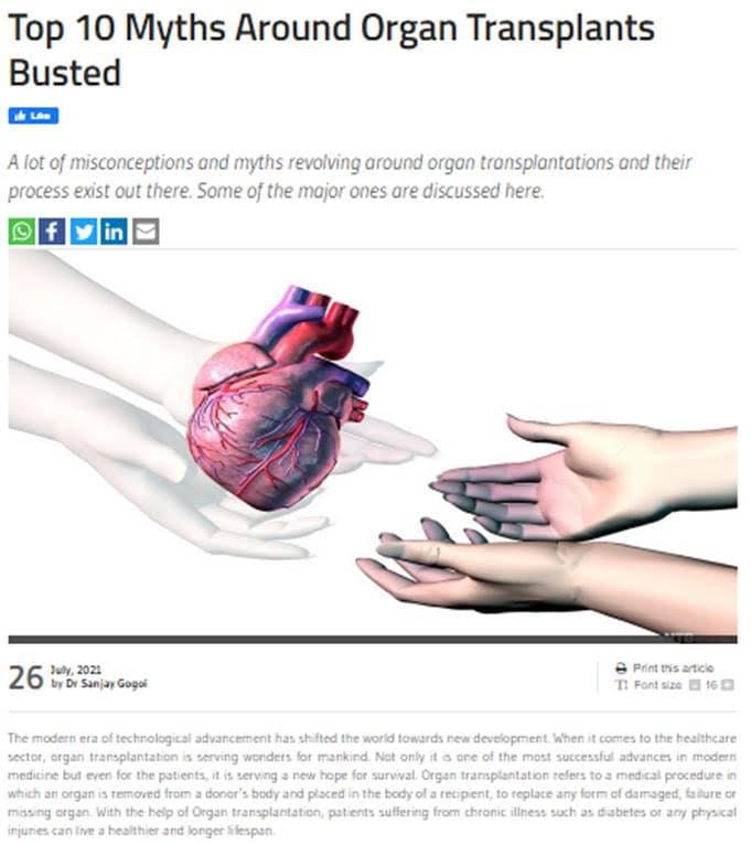 The modern era of technological advancement has shifted the world towards new development. When it comes to the healthcare sector, organ transplantation is serving wonders for mankind. Not only it is one of the most successful advances in modern medicine but even for the patients, it is serving a new hope for survival. Organ transplantation refers to a medical procedure in which an organ is removed from a donor’s body and placed in the body of a recipient, to replace any form of damaged, failure or missing organ. With the help of Organ transplantation, patients suffering from chronic illness such as diabetes or any physical injuries can live a healthier and longer lifespan. The criteria for organ transplant include a sequence of tests to determine the kind of donor organ to best fit the recipient and prevent organ transplant rejection. Initially, organ transplantation was restricted to only to the vital organs. However, with developed medical and surgical process have paved new paths for transplantation of several organs. A lot of misconceptions and myths revolving around organ transplantations and its process exist out there.