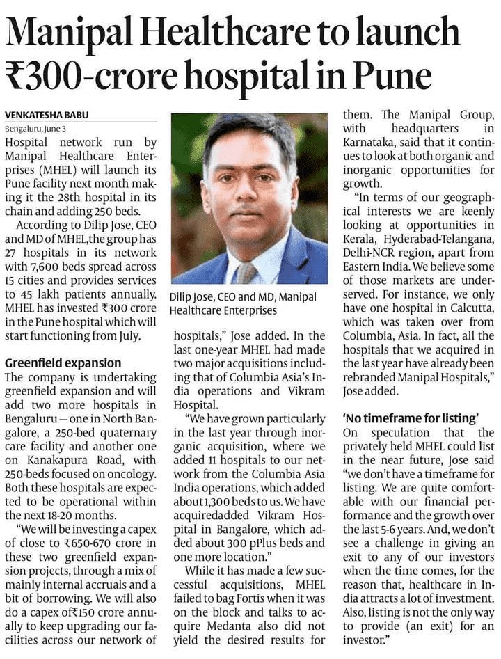 Spokesperson quoted: Mr. Dilip Jose, MD & CEO, Manipal Health Enterprises Pvt. Ltd