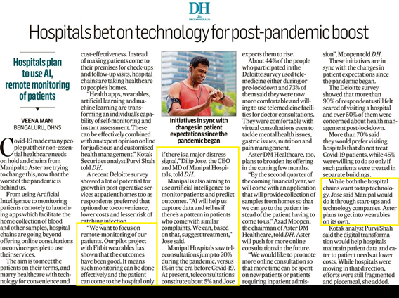 Mr. Dilip Jose said, We want to focus on remote monitoring of our patients. Our pilot project with Fitbit wearables has shown that the outcomes have been good. It means such monitoring can be done effectively and the patient can come to the hospital only if there is a major distress signal.