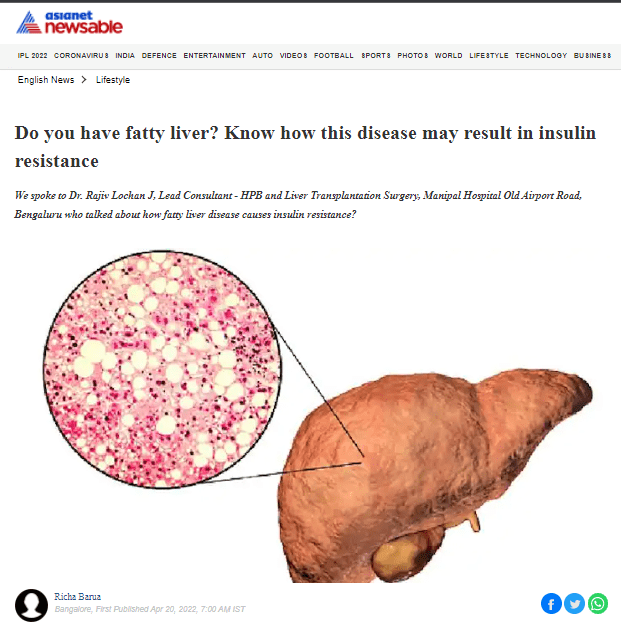 Lipid disturbances in the body may result in the development of insulin resistance and metabolic disorders. NAFLD is both the consequence and the cause of insulin resistance. Insulin resistance and diabetes affect liver pathogenesis and may result in NAFLD. In contrast, several mechanisms and physiological changes during NAFLD may result in insulin resistance, said Dr. Rajiv Lochan J, Lead Consultant - HPB and Liver Transplantation Surgery, Manipal Hospital Old Airport Road.
