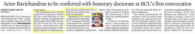 Bengaluru City University Vice-Chancellor Prof Lingaraja Gandhi announced that renowned pulmonologist at Manipal hospital, Dr. Satyanarayana Mysore will be conferred with a D.Sc for his work in the field of medicine.