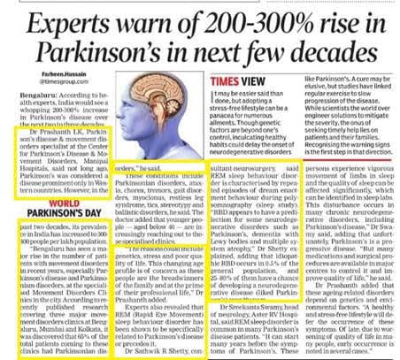 Bengaluru has seen a major rise in the number of patients with movement disorders in recent years, especially Parkinson’s disease and Parkinsonism disorders, at the specialised Movement Disorders Clinics in the city. According to recently published research covering three major movement disorders clinics at Bengaluru, Mumbai and Kolkata, it was discovered that 65% of the total patients coming to these clinics had Parkinsonian disorder, said Dr. Prashanth LK, Consultant - Parkinson’s Disease & Movement Disorder Specialist, Manipal Hospital Millers Road
