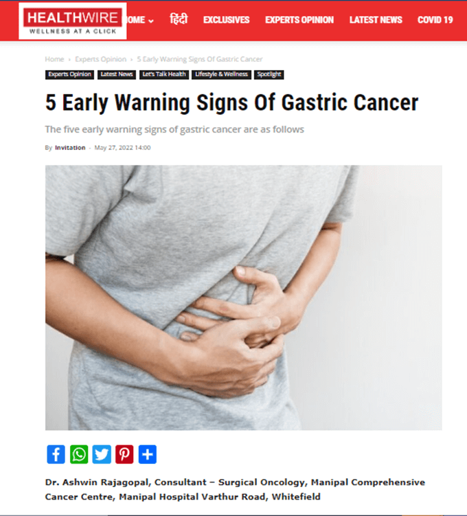 Doctor quoted: Dr. Ashwin Rajagopal, Consultant – Surgical Oncology, Manipal Comprehensive Cancer Centre, Manipal Hospital Varthur Road, Whitefield