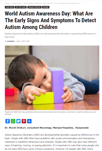 Dr Murali Chekuri, consultant Neurology, Manipal Hospitals, Vijayawada, said Autism Spectrum Disorders (ASD) are developmental disorders caused by differences in the brain. People with ASD often have problems with social communication and interactions, restricted or repetitive behaviours and interests.