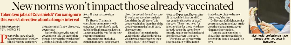 In a subgroup analysis, a certain number of people were given the second dose after six to 12 weeks. A secondary analysis found that the efficacy of this group was higher than that of the group vaccinated after 28 days, said Dr Sheetal Chaurasia, Consultant - Pulmonary Medicine, Manipal Hospitals, Whitefield.