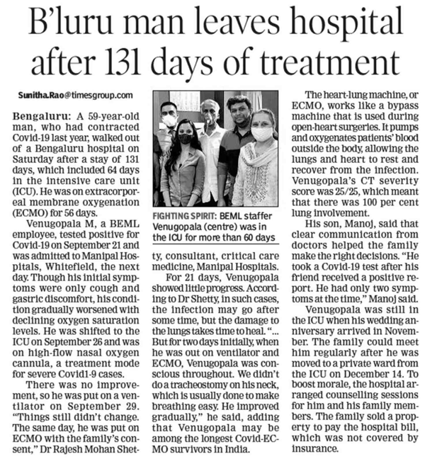 A 59-year-Old man was on ECMO for 56 days. He was discharged from Manipal Hospitals, White field after 131 days from the Hospital said Dr Rajesh Mohan Shetty, HOD & Consultant – Critical Care Medicine, Manipal Hospitals White field
